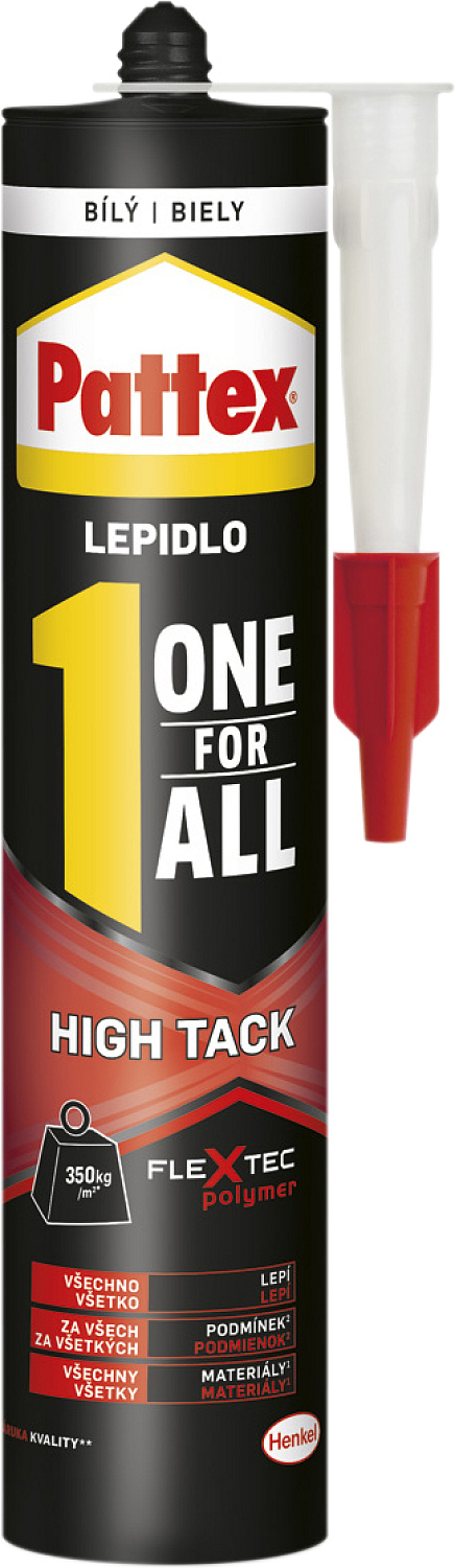 Einzelkomponenten weiße universelle Montagekleber Pattex ONE FOR ALL HIGH TACK kann sowohl drinnen als auch draußen verwendet werden. Seine patentierte Rezeptur FlexTec garantiert hohe Flexibilität und Festigkeit der Verbindung, auch unter den schwierigsten Bedingungen. Beim Kleben läuft es nicht, sinkt nicht ein, dämpft Geräusche und Vibrationen und klebt eine breite Palette von saugfähigen und nicht saugfähigen Materialien. Es härtet mit Luftfeuchtigkeit aus, eine Korrektur der Verbindung ist noch einige Minuten nach dem Verkleben möglich. Nach der Aushärtung überstreichbar und schleifbar, enthält keine Isocyanate und Lösungen, kann auch auf feuchtem Untergrund aufgetragen werden. PATTEX ONE FOR ALL HIGH TACK - der stärkste Montagekleber auf FlexTec-Polymerbasis.