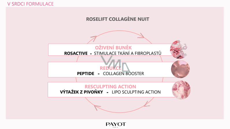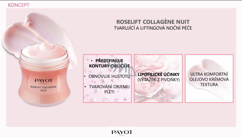 - Roselift collagène Nuit je noční tvarující péče obohacená o výtažek z pivoňky, který zpevňuje ovál obličeje a zahušťuje objemy obličeje v průběhu spánku.