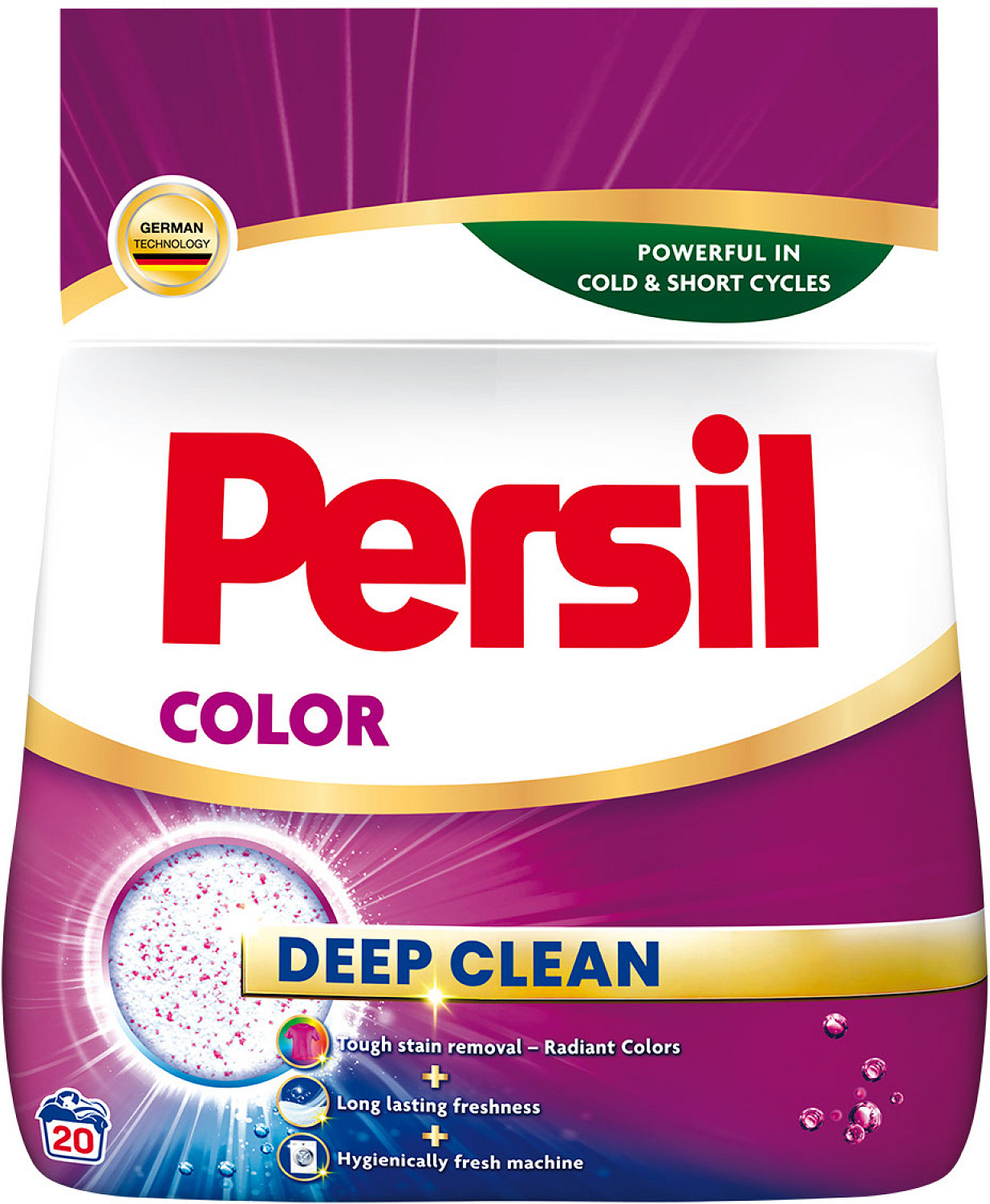 Persil Waschpulver Color hilft Ihnen, bei jedem Waschen perfekt saubere Wäsche und strahlende Farben Ihrer Kleidung zu erreichen. Das Waschpulver für bunte Wäsche hilft, die Farbintensität zu erhalten, bietet gleichzeitig eine erstaunliche Reinigungsleistung und verleiht der Waschmaschine hygienische Frische dank neuer Formulierung. Die Deep Clean-Technologie entfernt effektiv unangenehme Gerüche und bietet Ihrer Wäsche langanhaltende Frische.