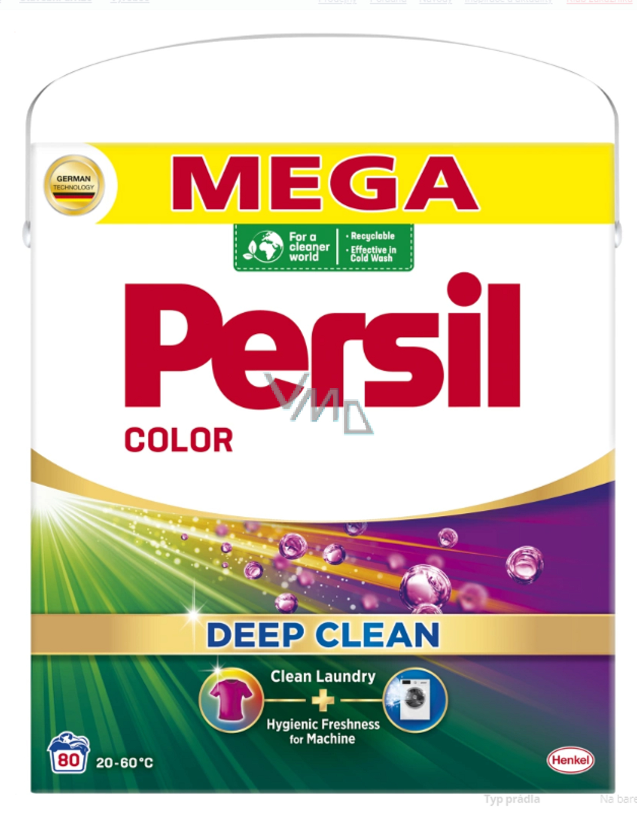 Persil Deep Clean Color prací prášek na barevné prádlo, který odstraňuje i ty nejodolnější skvrny a zároveň chrání barvu oblečení již od 20°C do 60°C. Díky účinným enzymům odstraní odolné skvrny a zachová barvy zářivé. Účinně odstraňuje skvrny: od ovoce, marmelády, jídla, skvrny bílkovinné povahy, skvrny na bázi škrobů a uhloHydrátů, skvrny od tuků a olejů aj. Napravuje poškozená textilní vlákna. Prací prostředek na barevné a stálobarevné prádlo je vhodný pro všechny druhy praček a i na ruční praní. Výborně se rozpouští a na tkaninách tak nezanechává nežádoucí stopy. Navíc k tomu dodá dlouhotrvající úžasnou příjemnou svěží vůni.