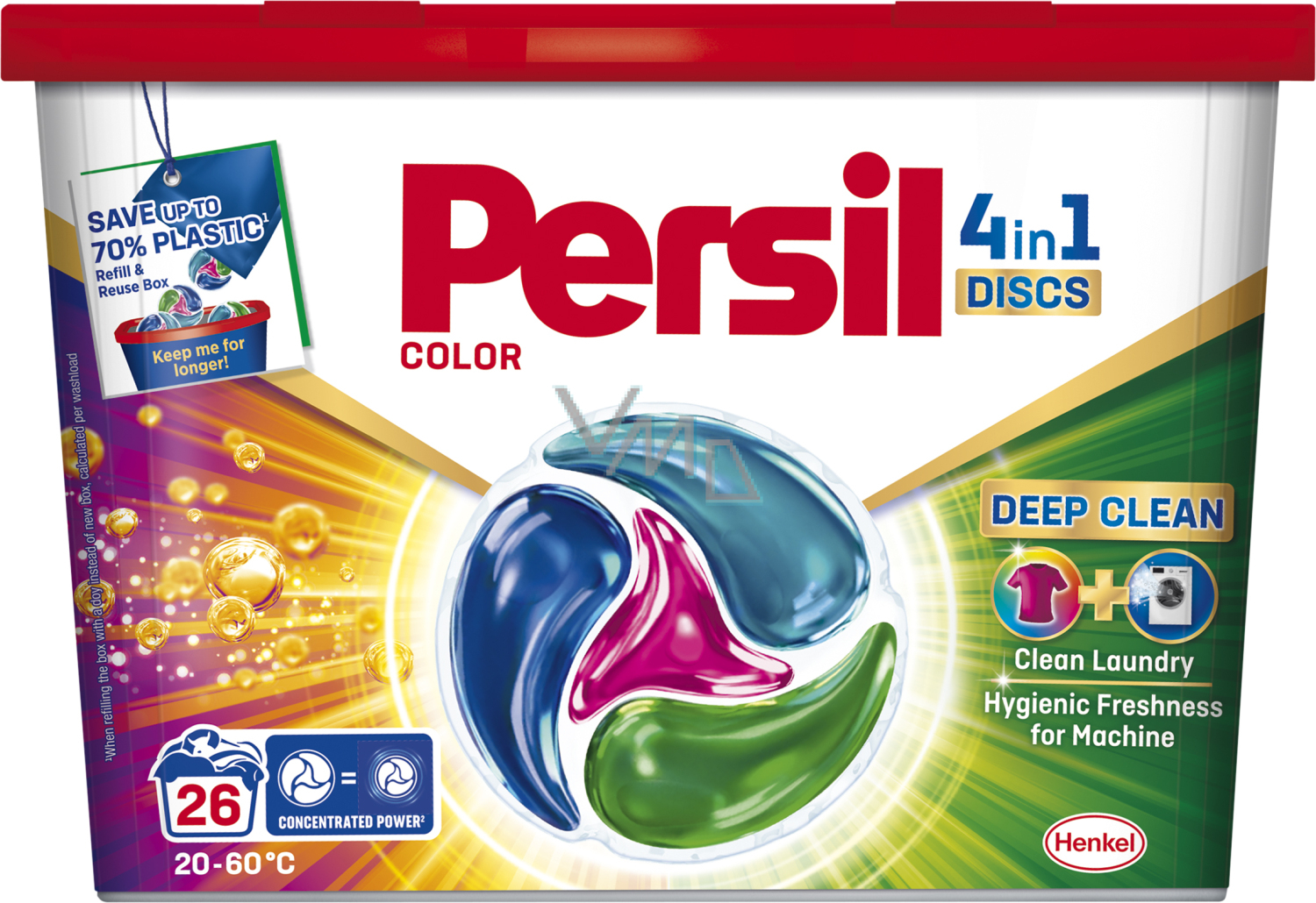 Složení těchto pracích kapslí pro barevné prádlo je navrženo tak, aby udrželo barvy zářivé a poradilo si i s těmi nejodolnějšími skvrnami. Kapsle jsou účinné i při nízkých teplotách (20 °C), díky čemuž můžete ušetřit za energie. Prací kapsle Discs 4 v 1 Color Deep Clean od značky Persil jsou šetrné i k planetě, složení obsahuje 92 % biologicky odbouratelných složek* a je vyráběno ve 100 % recyklovatelném obalu.