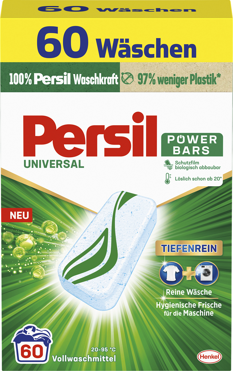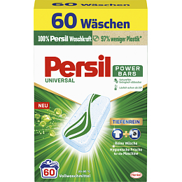 PERSIL Kapseln zum Waschen Eco Power Bars Universal sind ein effektives und tiefenreinigendes Waschmittel. Persil Kapseln Power Bars ist ein neuerdings innoviertes Pulver, das in Form von Tabletten in einer 100% biologisch abbaubaren Verpackung gepresst ist. Die Verpackung besteht aus recyceltem Papier und enthält bis zu 97% weniger Plastik*, und bietet gleichzeitig zuverlässig die 100%ige Kraft von Persil. Persil Eco Power Bars, die den Kleidungsstücken tiefenreine Sauberkeit und langanhaltende Frische verleihen, bieten den Verbrauchern bewährte Qualität des Waschmittels Persil in nachhaltigeren und kompakteren Verpackungen. Jedes Paket enthält 60 Waschtabletten, die einzeln in wasserlöslicher Folie verpackt sind, daher sind sie einfach zu verwenden, zu dosieren, praktisch und tragbar. Der schützende Umschlag um die Tabletten ist wasserlöslich und vollständig biologisch abbaubar, sodass er vor dem Waschen nicht entfernt werden muss.