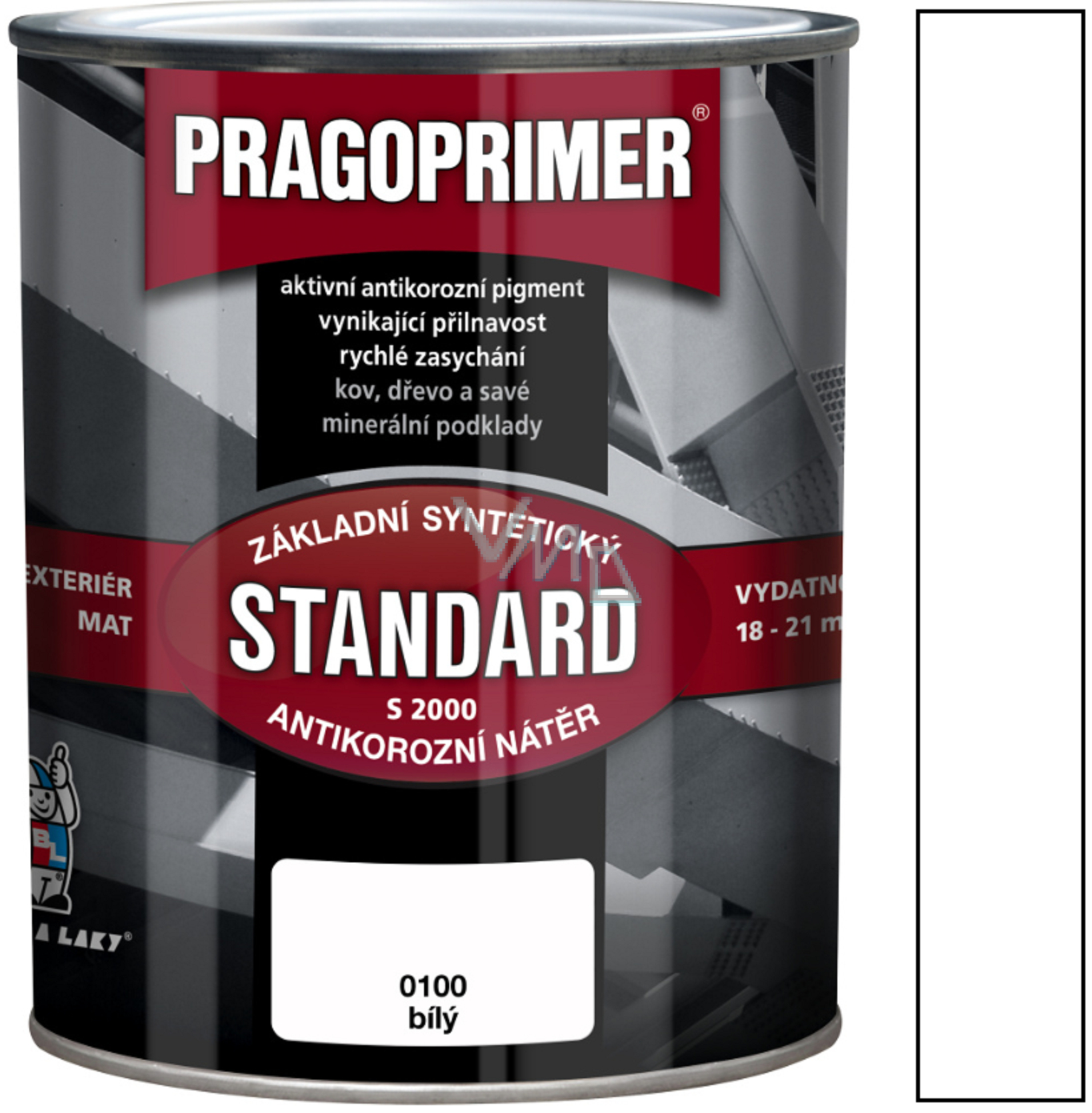 Pragoprimer Standard S2000 je kvalitní základní barva vhodná pro vnitřní i venkovní použití. Je ideální pro aplikaci na kovové a savé povrchy, zejména jako podklad pod syntetické a na vzduchu schnoucí nátěrové hmoty. Díky svému složení zajišťuje vynikající antikorozní ochranu, což ji činí perfektní volbou pro plechové konstrukce, stroje, kovový a dřevěný nábytek a další povrchy vystavené povětrnostním vlivům.