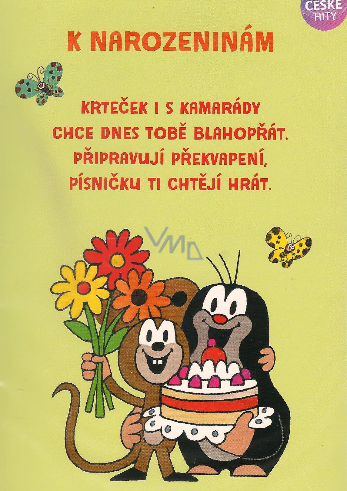 K narozeninám. Krteček i s kamarády chce dnes tobě blahopřát. Připravují překvapení, písničku Ti chtějí hrát. Krtek housle naladí, myška už si prozpěvuje. Zvířátka se seřadí, čáp to všechno diriguje. Pak zahraje Ti zvesela naše lesní kapela.