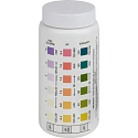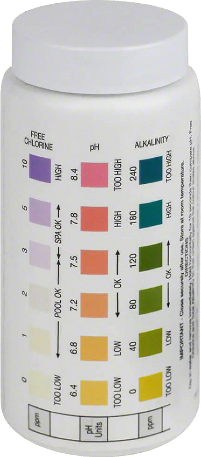 Tauchen Sie den Streifen in das Schwimmbadwasser und ziehen Sie ihn sofort heraus. Halten Sie den Streifen 10 Sekunden lang horizontal und vergleichen Sie dann pH, den Gehalt an freiem Chlor und die gesamte Alkalität (in dieser Reihenfolge) mit den auf der Verpackung aufgedruckten Farbmuster.