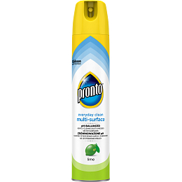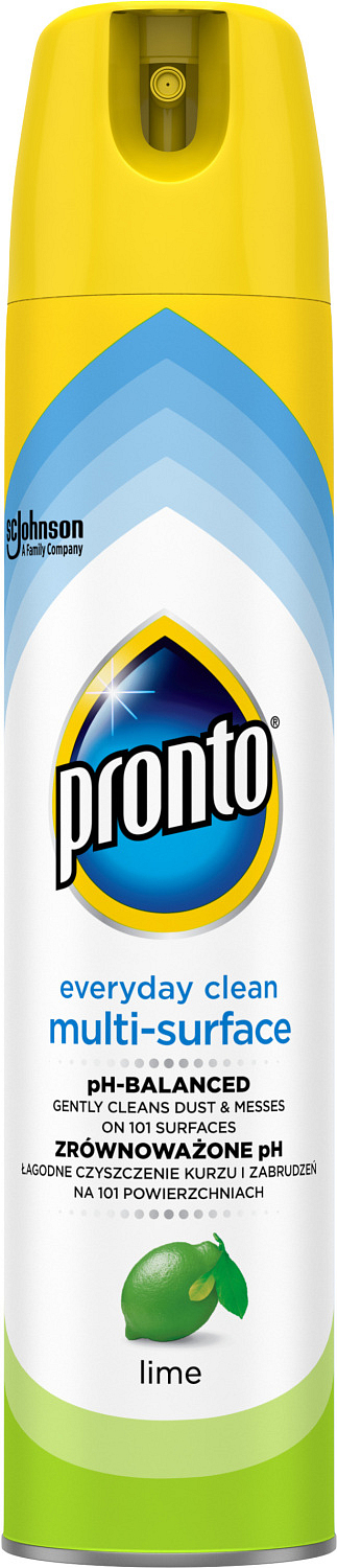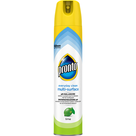 Pronto multifunktionales Spray mit Limettenaroma entfernt perfekt Staub, Flecken und Fingerabdrücke. Es enthält antistatische Inhaltsstoffe, die eine Wiederanlagerung von Staub verhindern. Es reinigt sanft und entfernt Staub von Metall, Holz, Glas und Elektronik (außer Plasma-/LCD-Bildschirmen). Nicht geeignet für unbehandeltes Holz. Pronto bietet Ihrem Möbelstück perfekte Pflege und Schutz.
