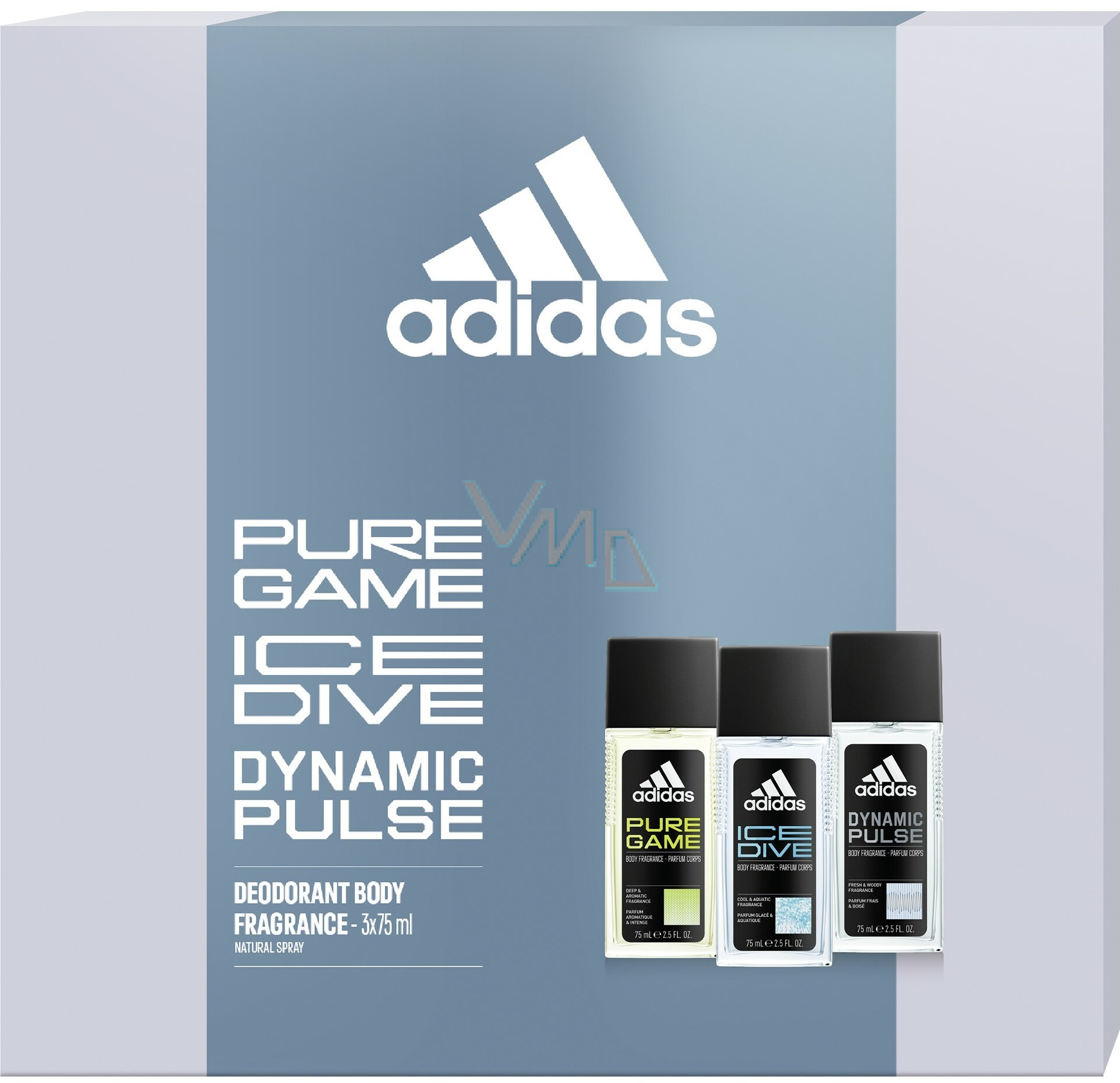 Adidas Pure Game parfümiertes Deoglas 75 ml + Ice Dive parfümiertes Deoglas 75 ml + Dynamic Pulse parfümiertes Deoglas 75 ml, Kosmetikset für Männer