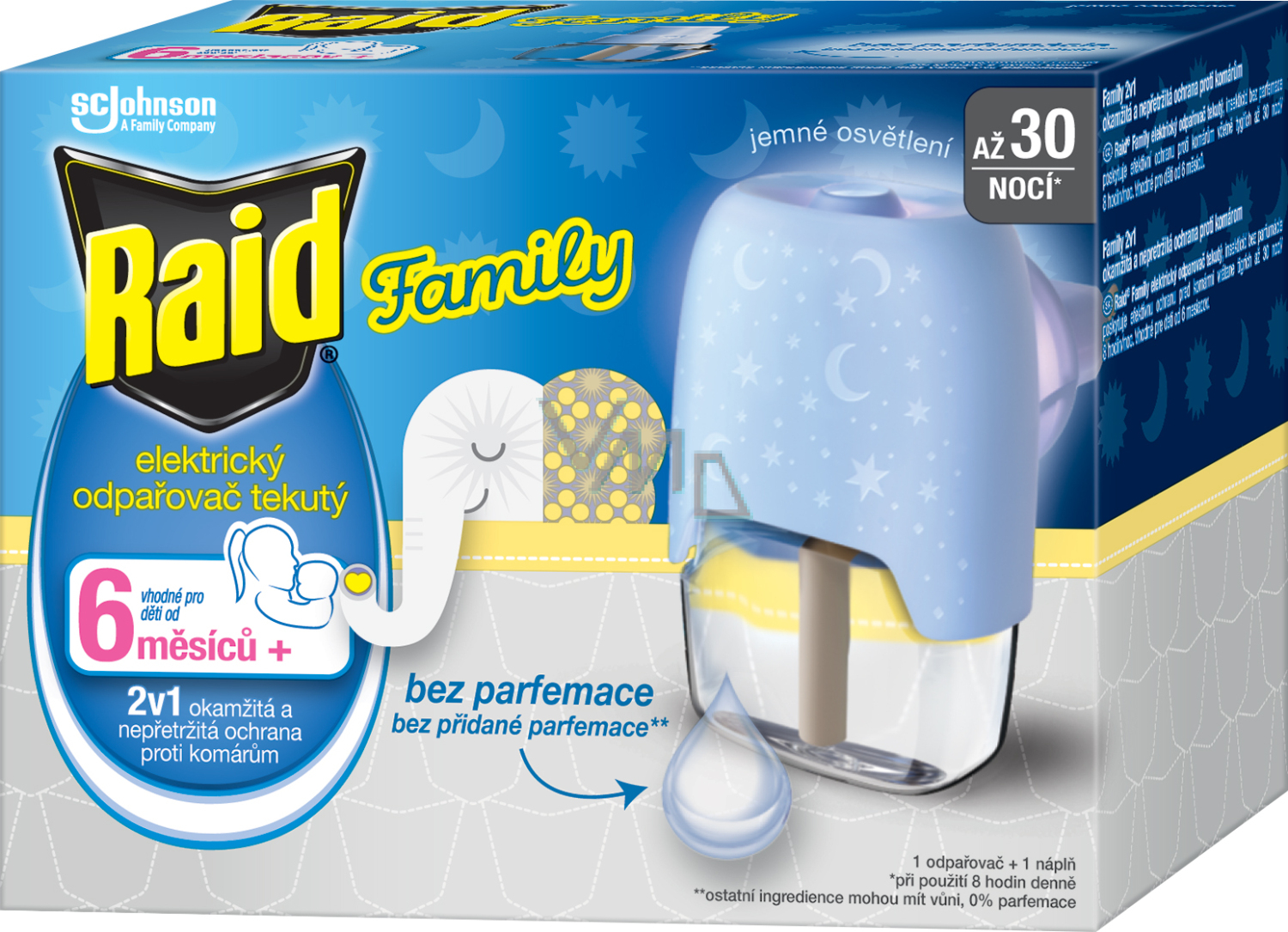 Schützen Sie Ihre Kinder vor lästigen Mücken mit dem elektrischen Verdampfer mit Flüssigkeitsfüllung RAID Family. Dieses Produkt ist speziell für Kinder ab 6 Monaten hergestellt. Es hat ein himmlisches Design und ist mit sanfter, beruhigender Beleuchtung ausgestattet, die das Nachtlicht für Kinder ersetzt. Es bietet sofortigen und kontinuierlichen Schutz gegen Mücken und tötet Mücken effektiv ab und weist sie auch bei geöffneten Fenstern ab. RAID Family enthält keine zusätzlichen Duftstoffe. Die Verpackung enthält einen Verdampfer und eine Nachfüllung, die Ihre Kinder bis zu 30 Nächte schützt.