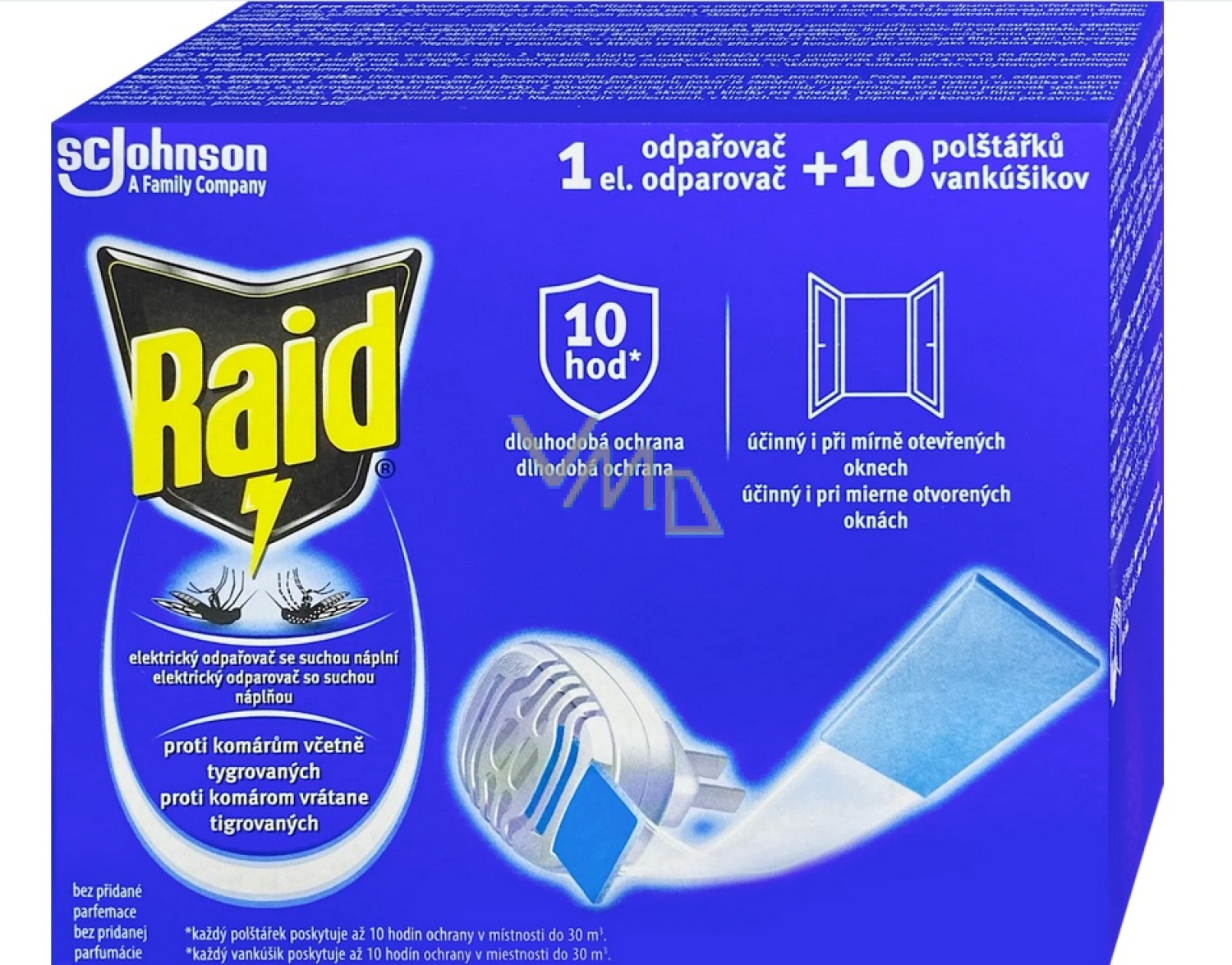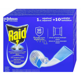 Der elektrische Verdampfer Raid mit trockenen Kissen schützt effektiv Ihr Zuhause vor Mücken und anderem fliegenden Ungeziefer. Die Verpackung enthält 1 elektrischen Verdampfer und 10 Ersatz trockene Kissen, die leicht in das Gerät eingesetzt werden können.