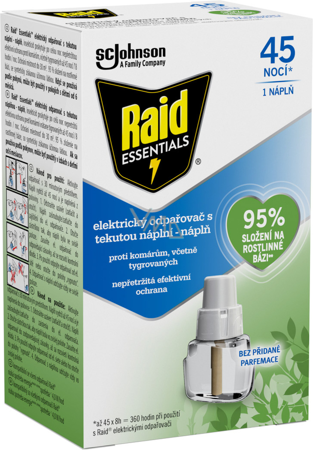 Nachfüllpackung für elektrischen Verdampfer ohne zugesetzte Duftstoffe ist zu 95 % pflanzenbasiert (mit synthetisch hergestelltem Wirkstoff). Sie tötet auch Mücken, die bereits im Raum verborgen sind, und ist wirksam gegen Tigermücken. Sie bietet einen niedrigen Energieverbrauch (<4 W/h) und gewährleistet Ihrem Haushalt zuverlässigen Schutz vor Mücken für bis zu 45 Nächte.