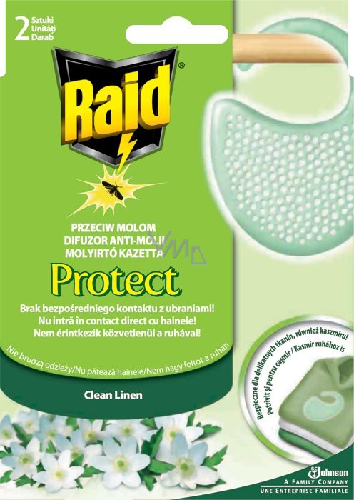 - Raid Protect proti molům vůně čistoty, insekticidní přípravek proti molům šatním kombinuje ochranu proti molům a ochranu oblečení.