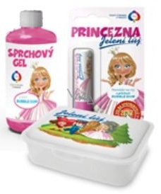Koupelová sada skládá: sprchový gel, pomáda na rtíky a dáreček pro každou princezničku (svačinový box).