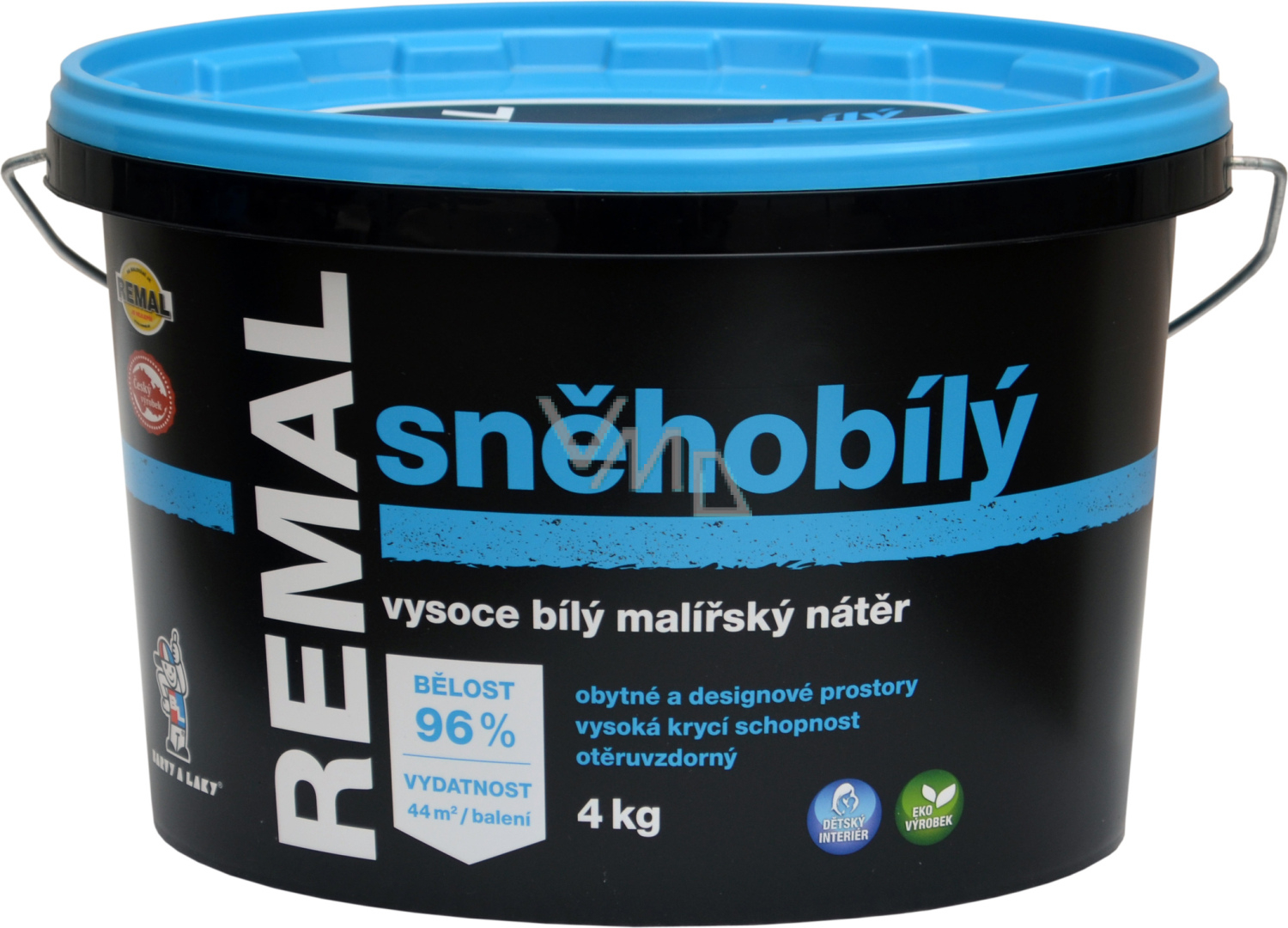 Malířská barva REMAL sněhobílý je doporučena díky své extrémní bělosti pro nátěry obytných a designových prostor. Barva na zeď REMAL sněhobílá s bělostí 96 % se používá k malování stěn i stropů v interiéru na omítky, sádrokartony a jiné podklady. Interiérová bílá malířská barva REMAL je dobře a snadno zpracovatelná, zdravotně nezávadná a ekologicky příznivá. REMAL Sněhobílý je vodouředitelná malířská barva s vysokou bělostí.