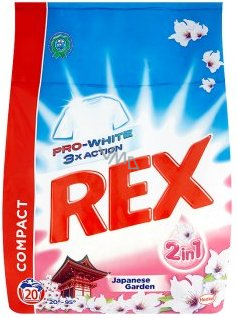 Rex Japanese Garden je univerzální Kompaktovaný prací prášek s vůní japonské zahrady působí efektivně ve 3 dimenzích na všechny problémy s praním: odstraňuje dokonce i odolné skvrny, poskytuje prádlu zářivou bělost a navíc vytváří ochrannou vrstvu na moderních vláknech, která chrání ještě silněji proti přilnutí nových skvrn.