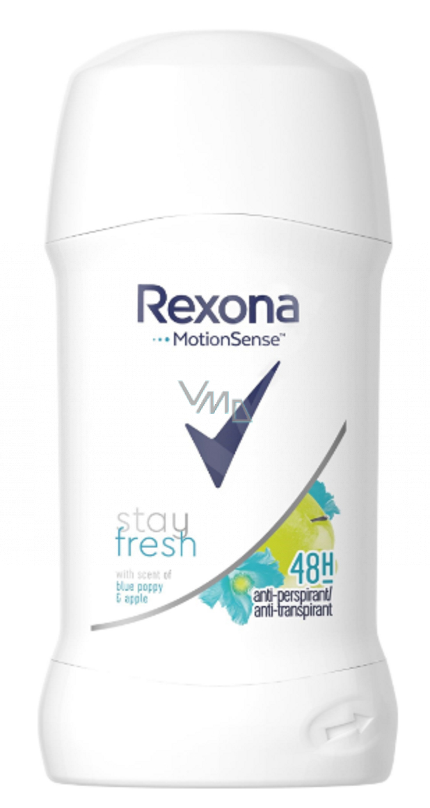 Rexona Blue Poppy&Apple tuhý antiperspirant stick je navržen tak, aby poskytl 48 hodin ochrany proti pocení a s ním i spojeným zápachem. Tento antiperspirant spojuje jemnou vůni modrého máku a jablka, díky němuž se můžete cítit sebevědomě, hýbat se celý den a stále se cítit svěží jakýkoli den v roce. Obsahuje inovativní MotionSense technologii, která postupně uvolňuje svěží vůni, když to nejvíce potřebujete. Funguje tak, že mikrokapsle, které uzavírají vůni, se po nanesení usídlí na pokožce. Když se hýbete, třením dochází k tomu, že kapsle praskají a tím se z nich uvolňuje vůně. Čím více se hýbete, tím více funguje.