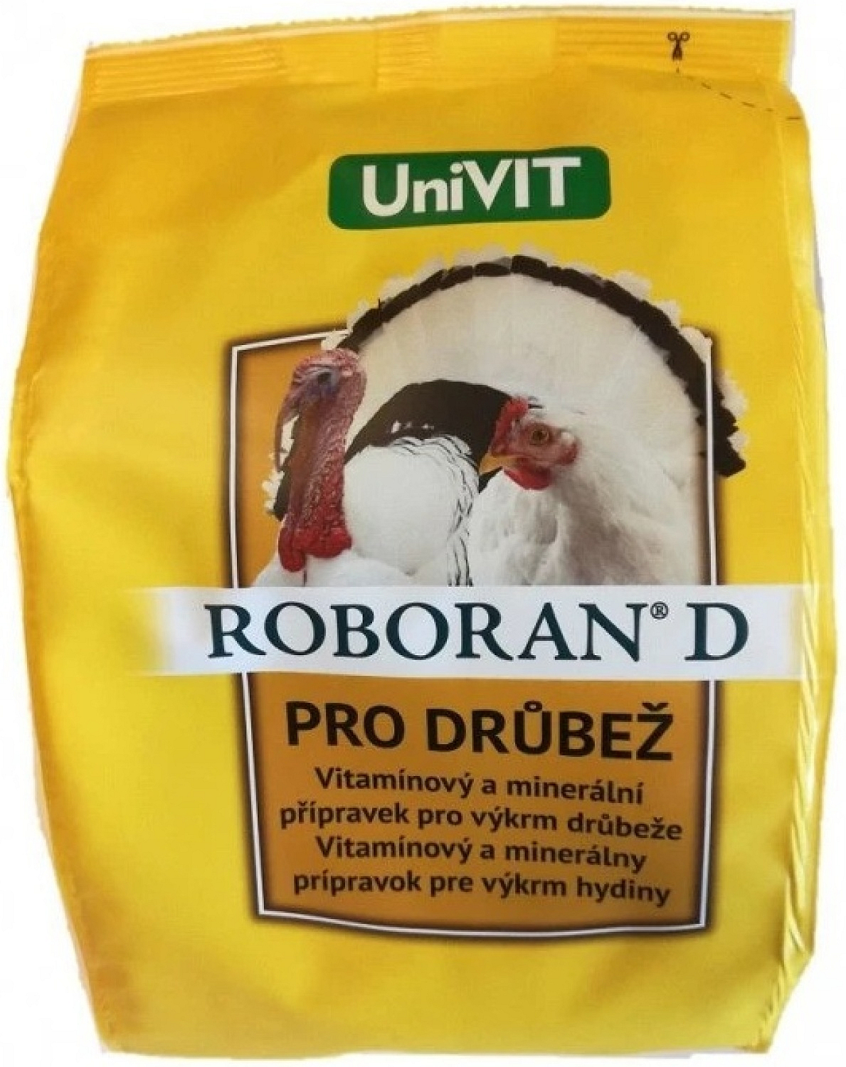 Roboran D ist ein kompletter Futterzusatz für Hühner, Küken, Truthähne, Perlhühner, Enten und Gänse. Es ergänzt die Futterration mit Vitaminen, unverzichtbaren Aminosäuren Methionin und Lysin, Makro- und Mikromineralien (Fe, Cu, Zn, Mn, J, Co, Mg, Se) sowie mit Futter-Salz in optimalen Dosen. Es wirkt sich positiv auf die Eierproduktion, die Gewichtszunahme, die Futteraufnahme und die allgemeine Verbesserung der Kondition und Gesundheit des Geflügels aus.