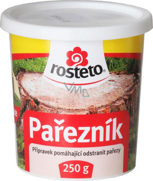 Do středu pařezu vyvrtejte díru o průměru cca 2 cm a hloubce cca 20 cm. Stejnou vyvrtejte šikmo ze strany asi 8 cm pod hranou pařezu tak, aby se obě díry propojily. Tímto způsobem lze likvidovat pažezy do průměru 30 cm. U větších průměrů je nutné počet děr úměrně navýšit. Do každé kombinace děr nasypte cca 100 g přípravku ""na pařezy"" a zalijte teplou vodou, kterou pak dolévejte podle potřeby po dobu 4 - 6 týdnů. V této době chraňte řeznou plochu pařezu před nadměrným deštěm. Nasycení pařezu přípravkem umožní jeho rychlý rozklad a usnadní jeho mechanické odstranění. Je-li možné odstranit pařez vypálením, pak můžete cca 6 týdnů po absorpci přípravku postupovat následovně: