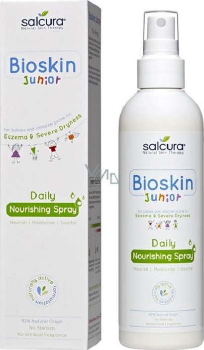 Salcura vyvinula řadu Bioskin Junior, která nabízí snadné, přírodní a účinné řešení pro pleť miminek a dětí nad 3 měsíce. 92% přírodní vyživující denní sprej pro suchou citlivou pokožku i pokožku se sklonem k ekzémům dětí i kojenců. Obsahuje rakytník řešetlákový, bohatý na omega mastné kyseliny, a dále přírodní vitamíny a minerály. Zklidňuje, vyživuje a hydratuje pleť. Má lehké a snadno aplikovatelné, pro děti příjemné složení, které se rychle vstřebává a dostává se tak i do ostatních vrstev pokožky, kde přispívá k výživě pleťových buněk.