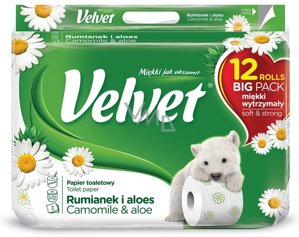 Kvalitní 3vrstvý toaletní papír Velvet, je bílý třívrstvý toaletní papír, který je potištěn jemným obrázkem heřmánku a voní po heřmánku. I díky tomu se stal tak oblíbeným v našich domácnostech i kancelářích. Tři vrstvy toaletního papíru poskytují extra jemnost a pevnost.