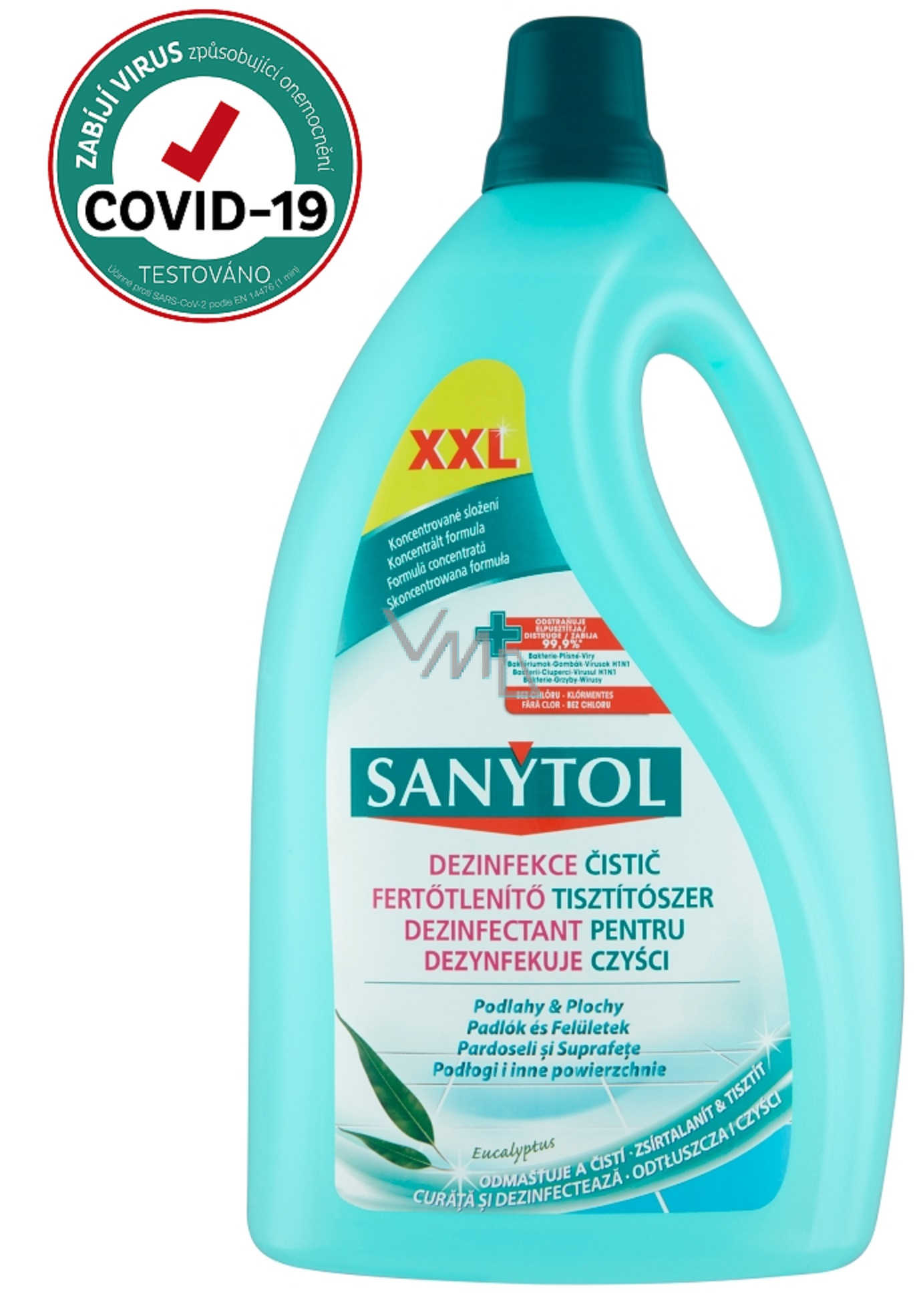 Sanytol na podlahy čistí, odmašťuje a díky trojímu účinku: baktericidnímu, Fungicidnímu a Virucidnímu dezinfikuje všechny materiály a plochy. Vhodný na velké plochy, WC, sanitární zařízení, odpadkové koše apod. Odstraňuje 99,99 % plísní, bakterií, virů. Neobsahuje chlór a nezpůsobuje skvrny. Místnost provoní svěžím eucalyptem. Uklízejte bez rizika o jakékoliv povrchové materiály a textilie.