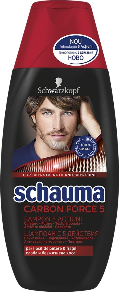 Pánský šampon Schauma Men Carbon Force 5 s pěti účinky pro slabé a jemné vlasy. Důkladně čistí a odstraňuje nečistoty, aktivuje kořínky, dodává vlasům sílu a odolnost, zvyšuje jejich pevnost a objemovou hustotu. S intenzivním posilujícím proteinem doplňuje vlasům ztracené látky a posiluje oslabené části vlasů. Pro sílu a lesk.