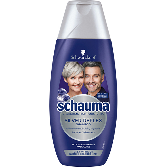 Schauma Silver Reflex Shampoo gegen gelbliche Töne, die auf grauem, aufgehelltem oder blondem Haar auftreten können.