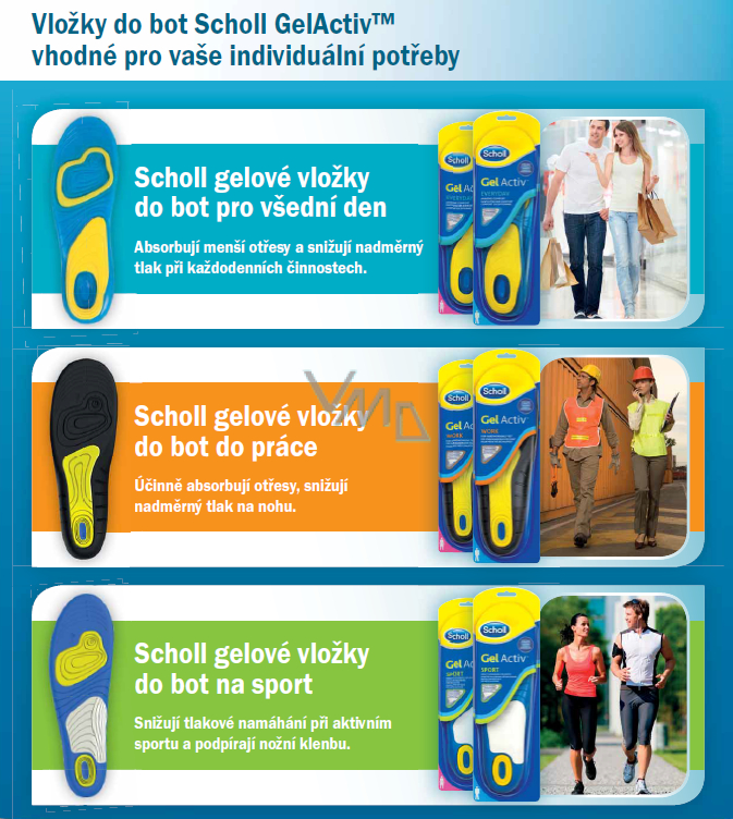 - Scholl gelové vložky do bot do práce jsou k dostání ve variantě pro ženy i muže, rozlišují se pouze podle velikosti.