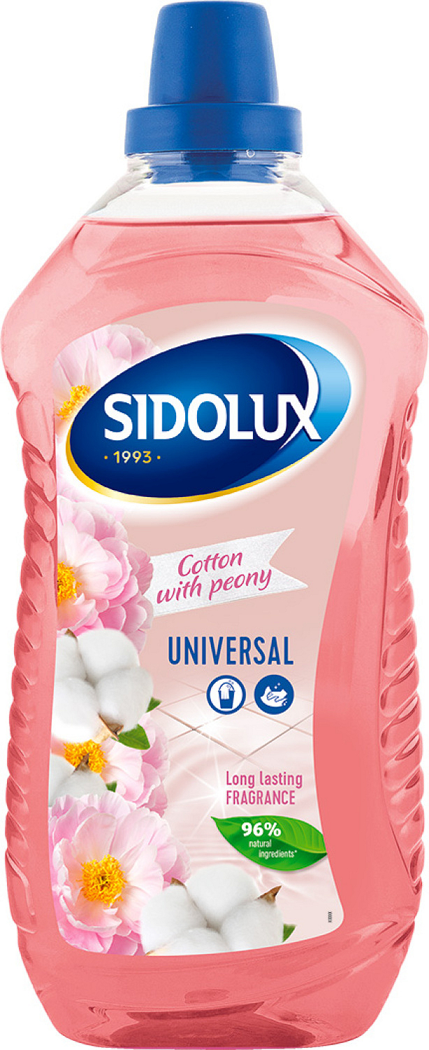 Gönnen Sie Ihrem Haushalt strahlende Sauberkeit und einen sanften Blumenduft mit Sidolux Universal Cotton & Peony – die effektive Wahl für die tägliche Reinigung.
