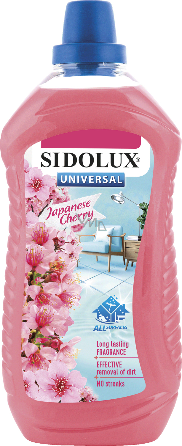 Sidolux parfumierter universeller Reiniger für alle abwaschbaren Oberflächen und Böden mit dem Duft der japanischen Kirschblüte. Frischer blumiger Duft der japanischen Sakura, ergänzt durch einen Hauch von Marseiller Seife.
