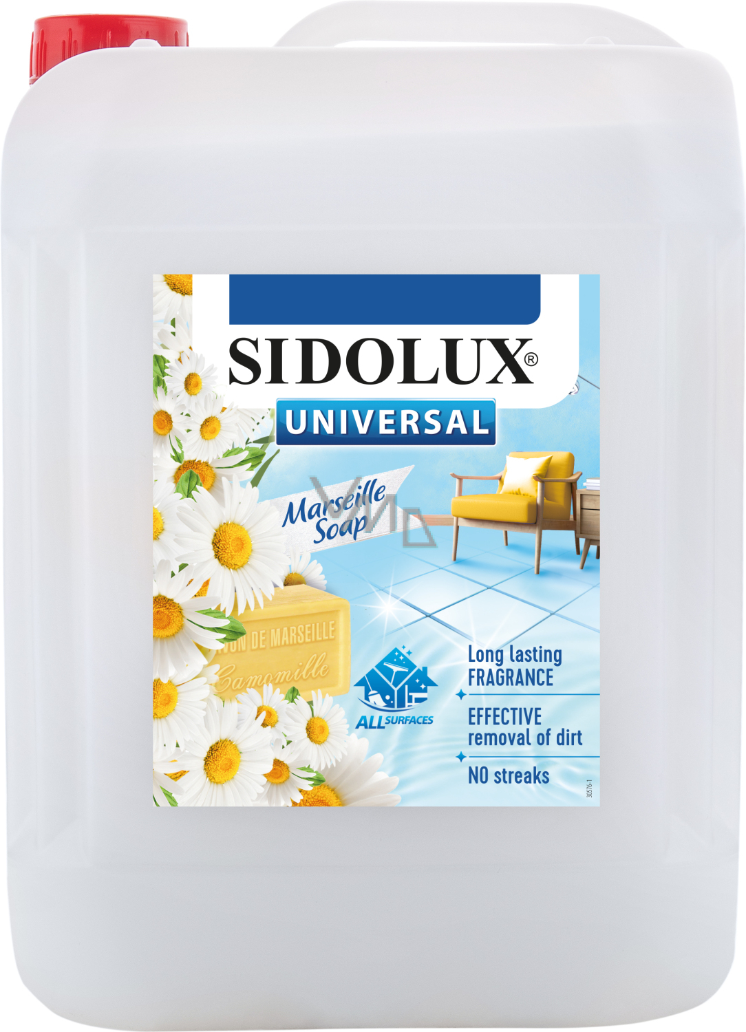 Sidolux parfemovaný univerzální čistící prostředek na všechny omyvatelné povrchy a podlahy s vůní Marseillského mýdla. Bohatá a přitom jemná vůně marseillského mýdla s lehkým nádechem heřmánku a jasmínu.