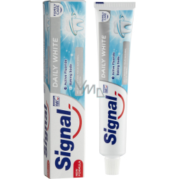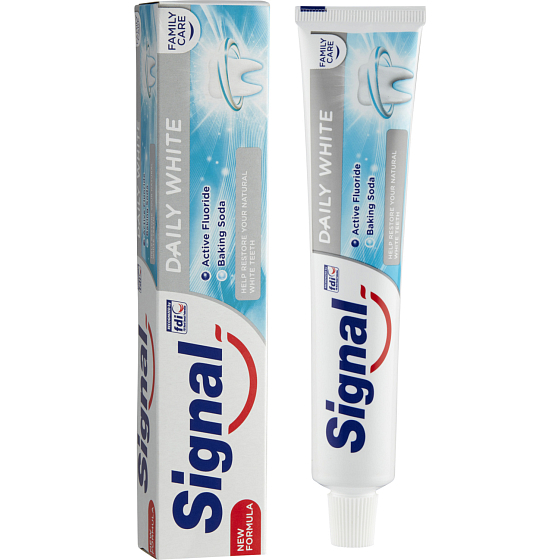 Die wirksame Zusammensetzung der Signal Daily White Family Care Zahncreme mit Natron hilft sanft dabei, die natürliche Weißheit der Zähne Ihrer Familie wiederzuentdecken. Der Fluoridgehalt stärkt den Zahnschmelz, und die Zähne sind besser gegen Karies geschützt. Die Paste ist speziell für die tägliche Anwendung durch die ganze Familie entwickelt.
