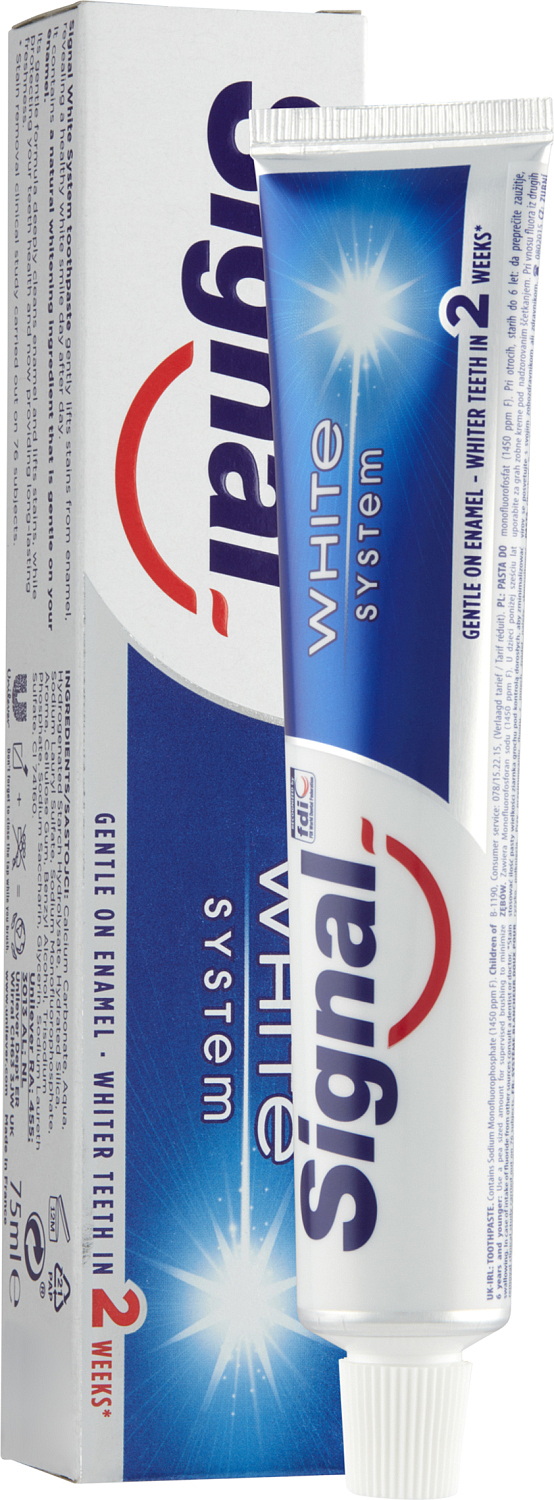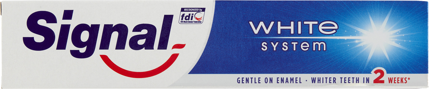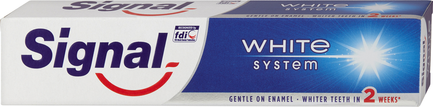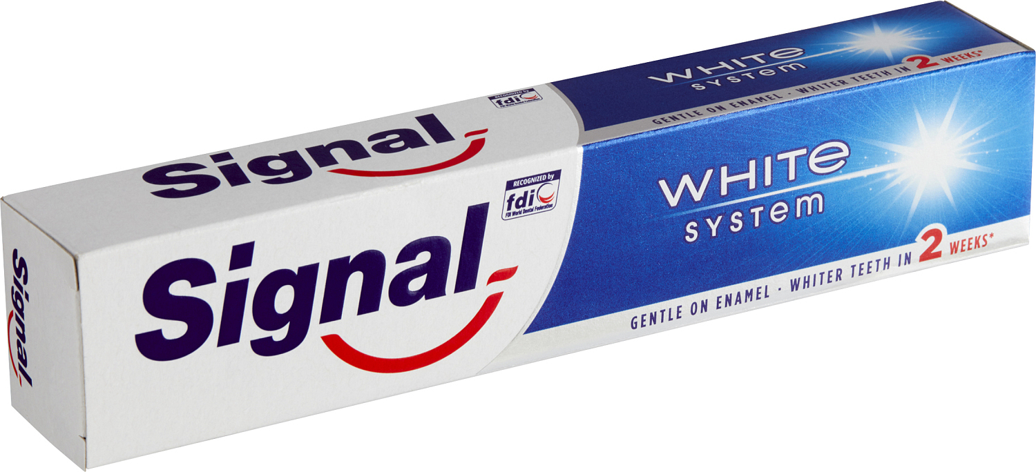 Die Zahnpasta Signal White System hilft aktiv, den Zahnschmelz zu stärken. Ihre Zusammensetzung mit Fluorid und Kalzium trägt zur Remineralisierung des Zahnschmelzes bei, und der spezielle Komplex White Activator mit einem Stoff, der in der professionellen Reinigung verwendet wird, hilft effektiv, Ihre Zähne zu bleichen.