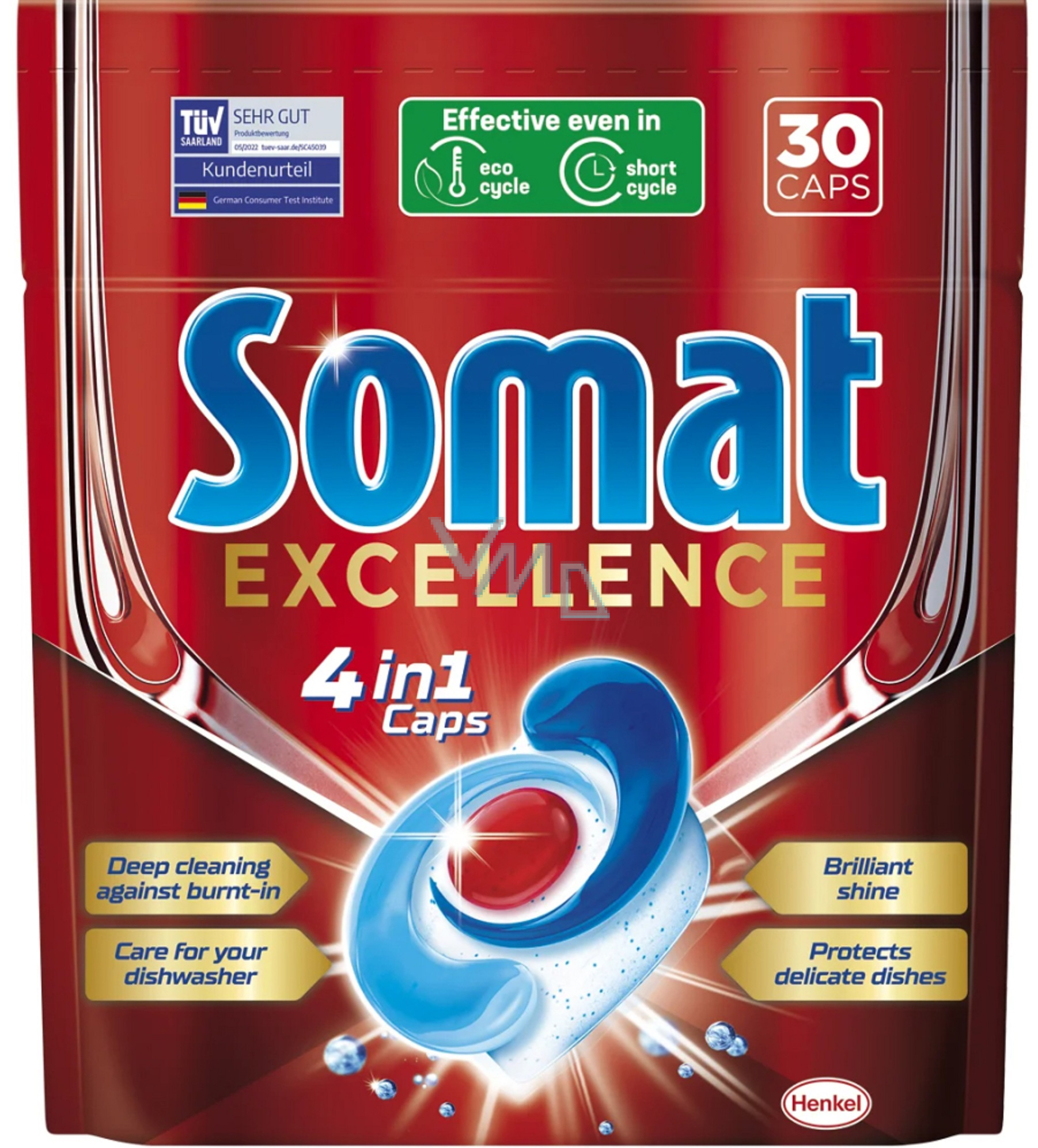 Somat Excellence tablety do myčky na mytí nádobí obsahují prémiový multifunkční prostředek na mytí nádobí vyrobený z prášku v kombinaci se 3 jedinečnými pevnými gelovými komorami v biologicky odbouratelné fólii rozpustné ve vodě. Díky silnému složení, které působí proti odolným připáleninám a zároveň nezanechává žádné zbytky ani zaschlé skvrny od vody bude vaše nádobí dokonale čisté. Somat Excellence tablety do myčky mají biologicky odbouratelnou fólii 100% rozpustnou ve vodě.