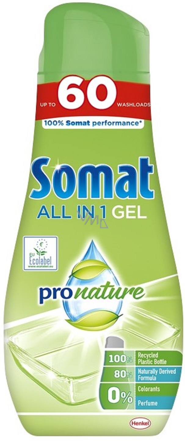 Somat gel do myčky pronature All In 1 působí proti odolným skvrnám a nečistotám! Gel na mytí nádobí lze snadno individuálně dávkovat podle kapacity myčky a stupně znečištění. Složení šetrné k životnímu prostředí je založeno na 80 % přírodních surovin, přesto poskytuje 100% Somat čisticí výkon. Obsahuje 0 % barviv, fosfátů a parfémů. Gel do myčky nádobí pronature All In 1 od značky Somat nezanechává žádné nežádoucí zbytky a poskytuje sklenicím zářivě čistý lesk po každém mycím cyklu.