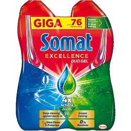 Somat Excellence Duo Gel für Geschirrspüler kombiniert zwei sich gegenseitig ergänzende Rezepturen, die angebrannte Essensreste und eingetrocknetes Fett auflösen. Somat Gel hinterlässt keine Rückstände auf dem Geschirr und sorgt bei jedem Spülgang für strahlenden Glanz.