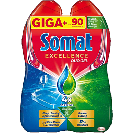 Schutz vor Flecken durch Wasserstein. Somat Excellence Duo Gel - unsere beste Formulierung des Somat Gels gewährleistet effektive Reinigung und strahlenden Glanz selbst bei niedrigen Temperaturen in Eco- und Kurzprogrammen. Die einzigartige Kombination aus zwei sich ergänzenden Formulierungen bietet eine tiefenreinigende Wirkung gegen eingebrannte Rückstände und starke Entfettungseffekte. Für sofortige Wirkung und extra Glanz des Geschirrs. Auch bei niedrigen Temperaturen in Eco- und Kurzprogrammen hinterlässt es strahlend sauberes Geschirr ohne Rückstände.