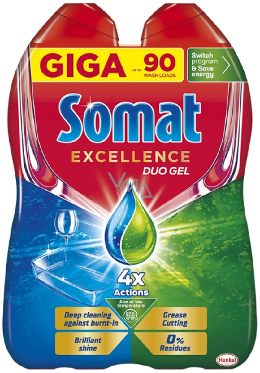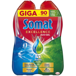 Multifunkční tekutý prostředek na mytí nádobí Somat Excellence Duo kombinuje dvě doplňující se složení, která působí proti odolným skvrnám a nečistotám! Gel do myčky nádobí se rychle rozpouští i při ekologických cyklech s nízkými teplotami, takže nezanechává žádné zbytky a poskytuje zářivě čistý lesk po každém mycím cyklu. Navíc složení gelu proti mastnotě obsahuje aktivní odmašťovače pro čisté a lesklé nádobí! Tekutý čisticí prostředek do myčky nádobí lze snadno dávkovat podle kapacity myčky a znečištění nádobí. Můžete ušetřit vodu a až 20% energie přepnutím na eco program s nízkou teplotou nebo krátký program s nízkou teplotou při zachování excelentní čistoty a lesku. Somat Excellence Duo Gel poskytuje perfektní mycí výsledek dokonce i v případě, že kontrolka soli nebo oplachovače svítí. V obou případech je funkce oplachovače i změkčovače vody zachována.