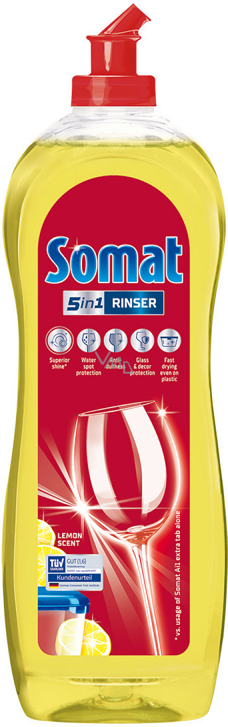Leštidlo Somat Rinser Lemon dává Vašemu nádobí zářivý jasný lesk. Leštidlo Somat Rinser změkčuje vodu, aby odtékala z nádobí rovnoměrně. Nádobí je tak rychleji suché a nezůstávají na něm kapky vody ani usazeniny vodního kamene. Zanechává Vaše nádobí zářivé a bez zaschlých vodních kapek. Pro dokonalé výsledky používejte Somat Rinser v kombinaci se standardními prostředky Somat (tablety, gel nebo prášek Somat Classic) a se solí Somat.