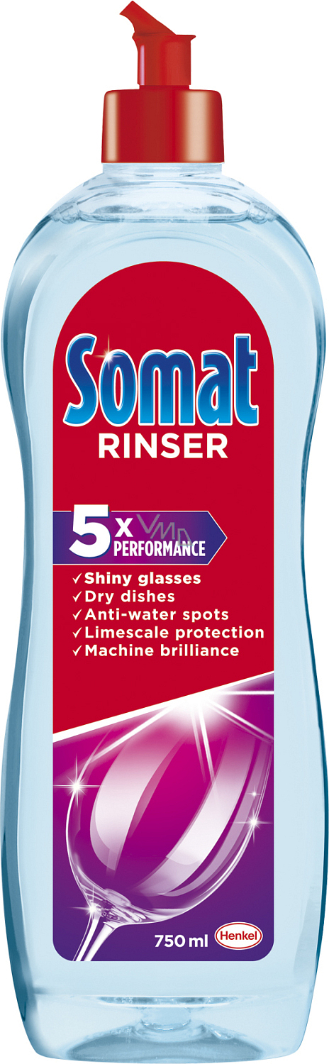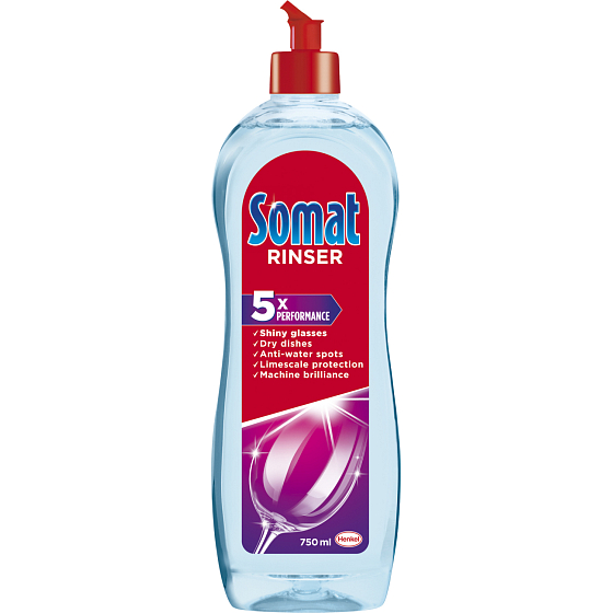 Der Somat Rinser gibt Ihrem Geschirr strahlenden Glanz. Der Somat Rinser weicht das Wasser auf, sodass es gleichmäßig vom Geschirr abfließen kann. Das Geschirr ist dadurch schneller trocken und es bleiben keine Wassertröpfchen oder Ablagerungen von Kalk zurück. Es hinterlässt Ihr Geschirr strahlend und ohne eingetrocknete Wassertröpfchen. Für perfekte Ergebnisse verwenden Sie Somat Rinser in Kombination mit den Standardprodukten von Somat (Tabletten, Gel oder Pulver Somat Classic) und mit Somat Salz.
