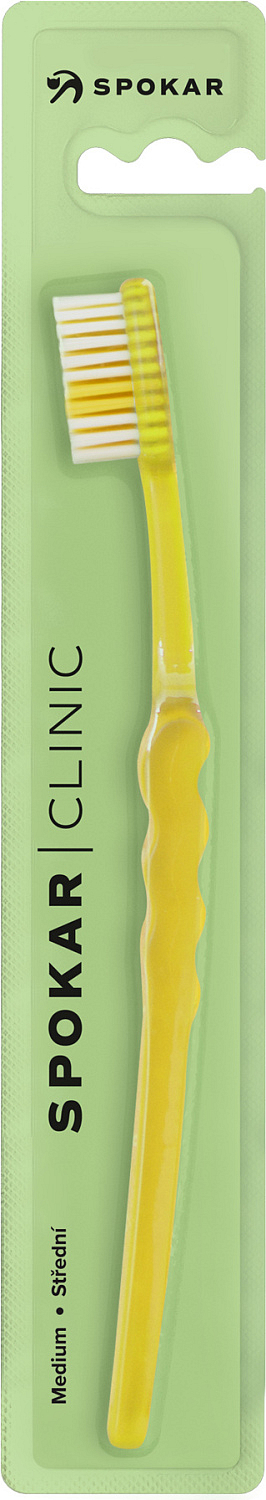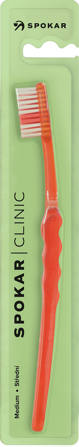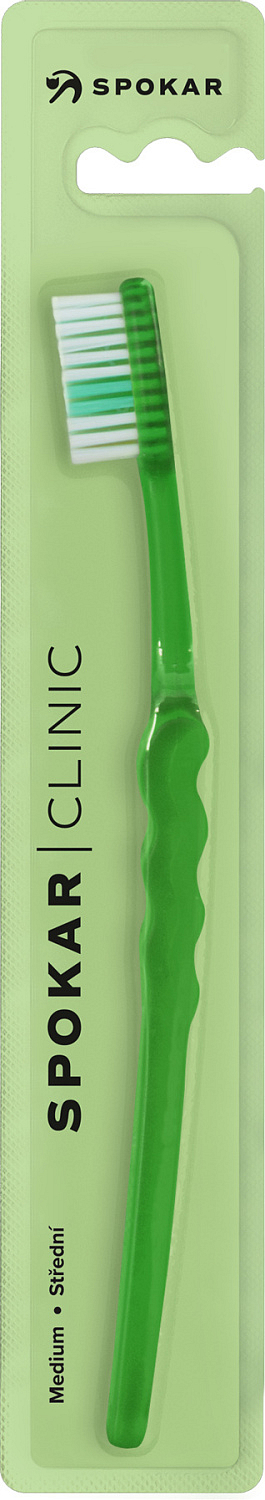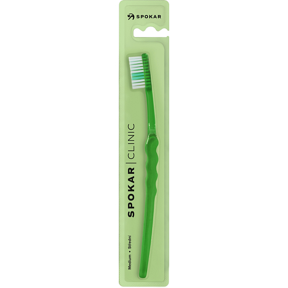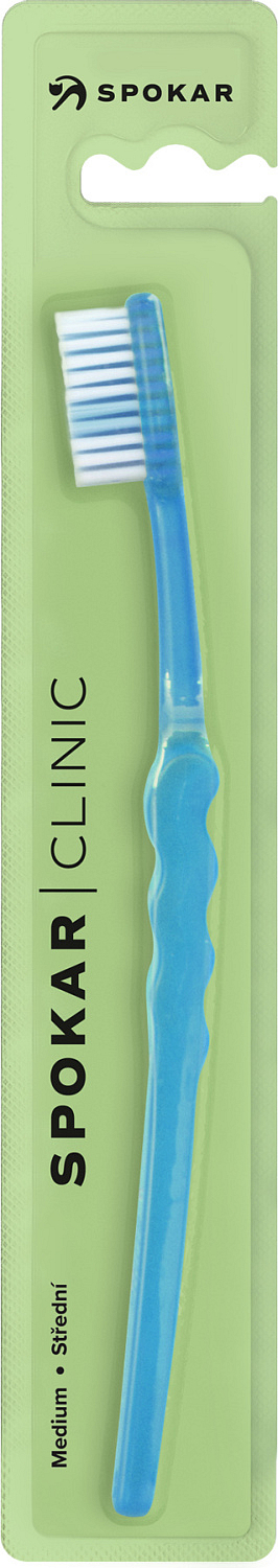 Spokar 3416 Clinic Zahnbürste hat eine breit abgestufte Faserabschneidung, ergonomisch geformten Griff. Nylonfasern. Härte der Fasern weich. Der größere Kopf ist mit gleichmäßig geschnittenen Fasern ausgestattet. Der gebogene Griff mit gewelltem Mittelteil ermöglicht ein einfaches Halten, genaue Kontrolle der Bürste beim Reinigen und guten Zugang zu allen Zähnen.
