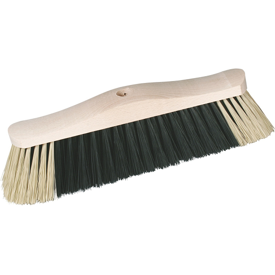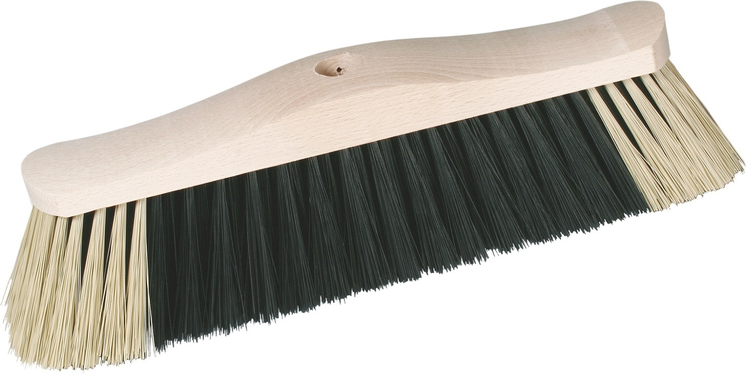 Set aus Besen mit Stiel und Kehrschaufel mit Besen. Der Besen ist mit synthetischen Fasern (PET) ungespalten ausgestattet. Der Stiel (Griff) ist aus Metall und hat eine Länge von 120 cm mit Kunststoffüberzug und Gewinde, mit einem Loch zum Aufhängen. Die Kehrschaufel hat einen Gummi-Flush.