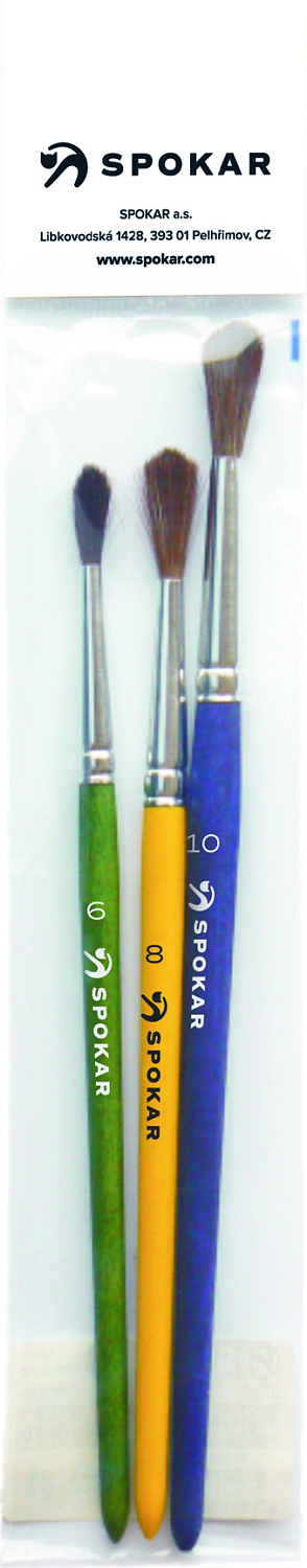 Hochwertiger Schulpinsel SPOKAR, rund, hat einen lackierten Holzgriff, feine tierische Fasern, sichtbare Fasernlänge von 14 bis 20 mm, das Set enthält die Größen Nummer 6, 8, 10.