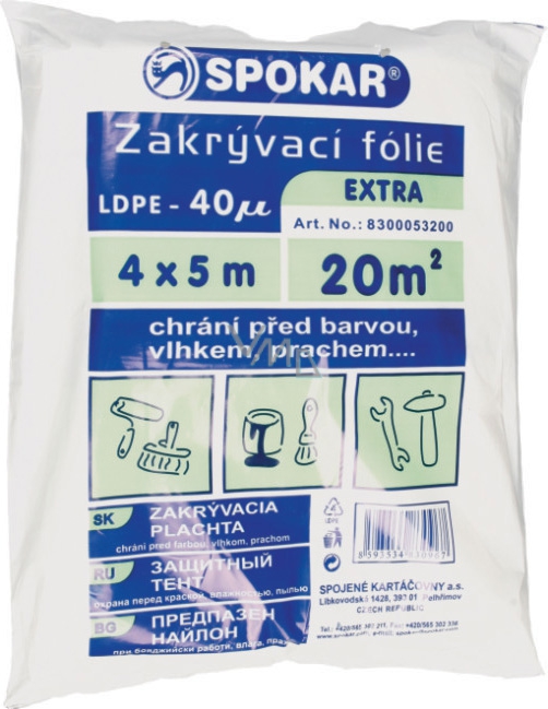 Spokar zakrývací fólie hobby na malování o rozměru 4 x 5 metry a tloušťce 40 µ je opravdu silná fólie. Zakrývací fólie se používají na zakrytí podlahy, nábytku atd. Chrání před barvou, vlhkem a prachem.
