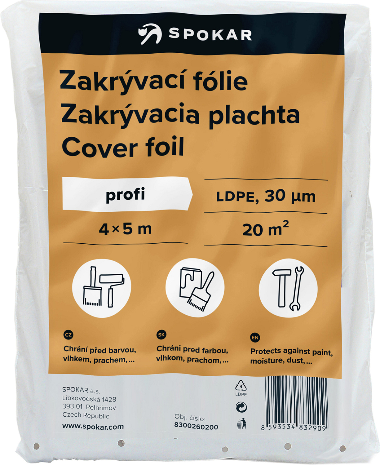 Spokar Abdeckfolie in der Größe 4 × 5 m mit einer Dicke von 30 µm (Mikrometer) aus LDPE. Abdeckfolien werden verwendet, um Böden und Möbel abzudecken. Sie schützen beim Malen vor Farbe, Feuchtigkeit und Staub.
