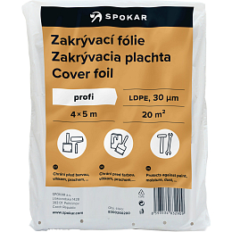 Spokar Abdeckfolie mit den Abmessungen 4 × 5 m und einer Dicke von 35 µm (Mikrometer) LDPE. Abdeckfolie wird verwendet, um den Boden und Möbel abzudecken. Sie schützt vor Farbe beim Malen, Feuchtigkeit und Staub.