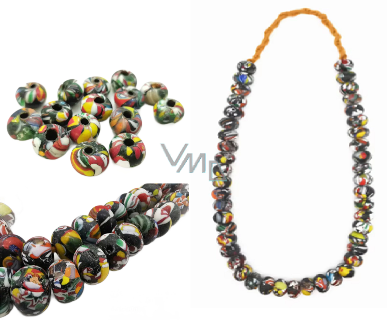 Náhrdelník ze starověkého skla ručně vyráběné z Nepálu a z abakusových korálků s průměrem cca 2 cm s velkým květem. Délka náhrdelníku je cca 64 cm.