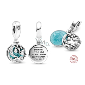 Stříbrný přívěsek s motivem čápa nesoucího uzlíček s děťátkem je skvělým dárkem k narození miminka. Vnitřní část přívěsku je dekorována světle modrou glazurou s jemnou perletí a zadní část přívěsku je opatřena nápisem „Twinkle twinkle little star do you know how loved you are?“ Třpytivá, třpytivá malá hvězdičko víš, jak jsi milovaná.