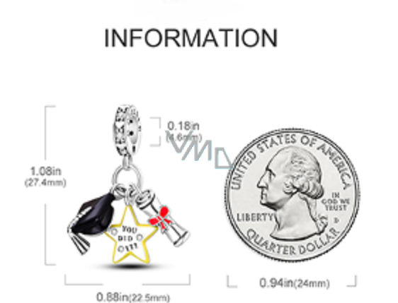 Visací přívěsek s promoční čepicí, diplomem zdobeným červenou stuhou a hvězdou s vyrytým nápisem "You did it!", „Dokázal jsi to“. Navrženo s hladkým černým, červeným a žlutým smaltem a bílými třpytivými drahokamy Zirkonu. Prsten přívěsku obsahuje bílé třpytivé drahokamy a malá srdce kolem dokola a na bocích je vyryto slovo „absolvent“. Tento přívěsek je roztomilý způsob, jak připomenout vaši tvrdou práci během vaší vzdělávací cesty.