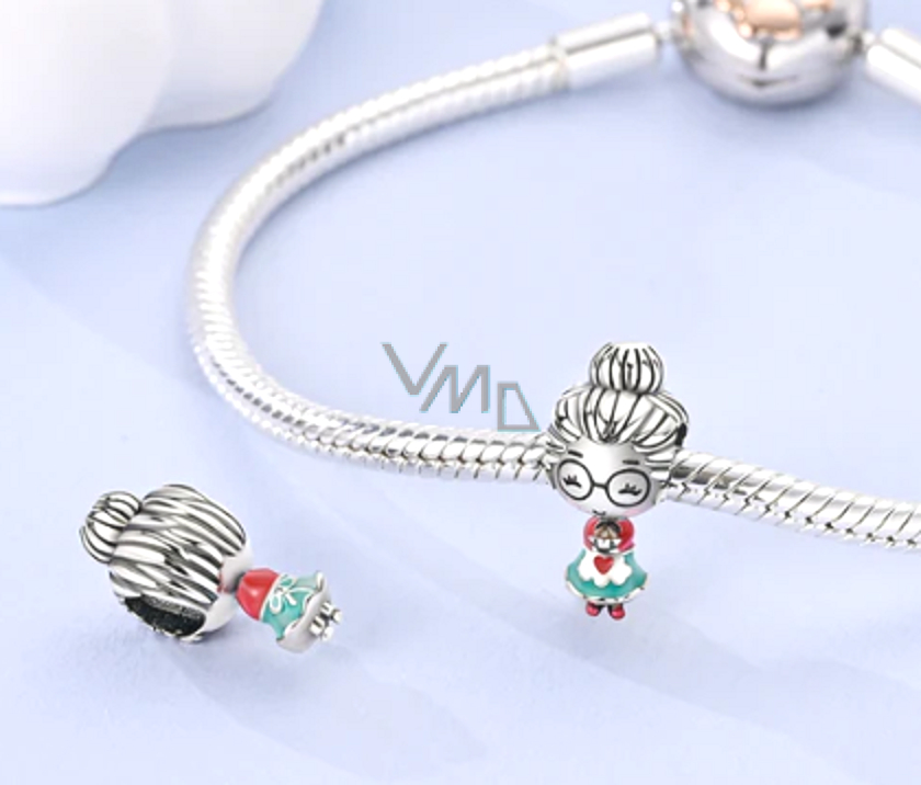 Přívěsek s babičkou držící koláč, navržený s hladkým červeným, modrým a hnědým smaltem. Babička je výjimečná žena, která je pro svá vnoučátka symbolem moudrosti, klidu, pohody a obrovským zdrojem lásky. A i když není se svými vnoučátky stále spolu, bude pro ně vždy přístavem, kde se jim dostane pochopení a pohlazení.