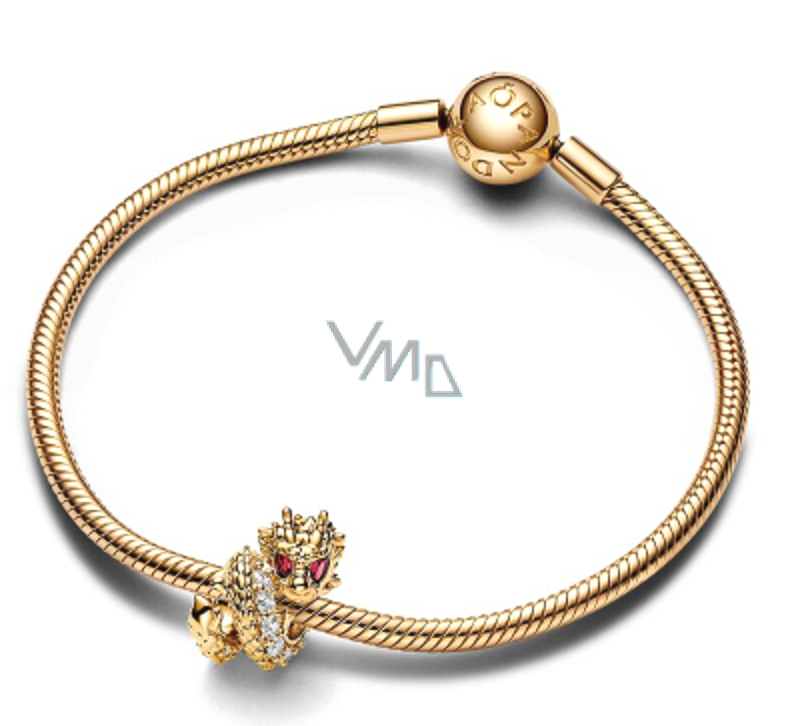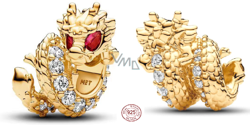 Pozvěte štěstí v roce 2024 s dvoubarevným čínským rokem dračího kouzla. Rok 2024 je rokem draka - 5. zvíře v čínském zvěrokruhu, toto mýtické stvoření představuje štěstí, sílu, moc, moudrost a zdraví. Tento přívěsek jemně pozlacený 14karátovým zlatem, obsahuje propracovaného draka s řadou pavučin na jedné straně těla a detaily stupnice na druhé. Třpytivé červené kameny ve tvaru Hrušky oživují dračí oči a jeho tělo je stočené tak, aby se obepínalo kolem vašeho náramku nebo náhrdelníku, což vytváří pocit pohybu. Noste toto kouzlo, abyste pozvali vlastnosti draka do svého roku, který je před vámi, nebo jej darujte milované osobě, která se narodila v roce Draka.